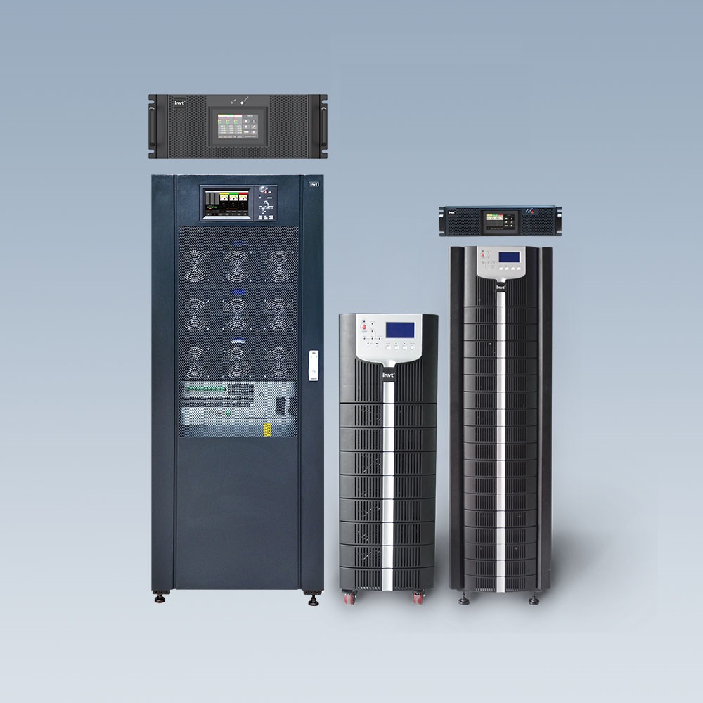 UPS Monofásicas, Trifásicas y Modulares; de doble conversión en linea. Aplicaciones desde pequeñas oficinas, equipamientos médicos, industrias y de hasta 500kVA en un solo gabinete. Opciones Rackeables, torres, modulares y con transformador de aislación